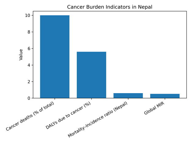Cancer accounts for approximately 10% of total deaths in Nepal and 5.6% of Disability-Adjusted Life Years (DALYs) according to Global Burden of Disease estimates. Nepal’s mortality-to-incidence ratio of 0.6 exceeds the global average of 0.52, indicating that delayed diagnosis and limited access to treatment contribute substantially to cancer mortality (Figure 1). The most common cancers reported in Nepal include cervical cancer (approximately 19%), lung cancer (approximately 17%), stomach cancer, and breast cancer. Tobacco use (both smoking and chewing) combined with alcohol consumption is associated with more than a 13-fold increase in cancer risk. Additional risk factors include household air pollution from biomass fuel use, rapid urbanization, dietary transitions, physical inactivity, and low screening uptake for breast and cervical cancers.