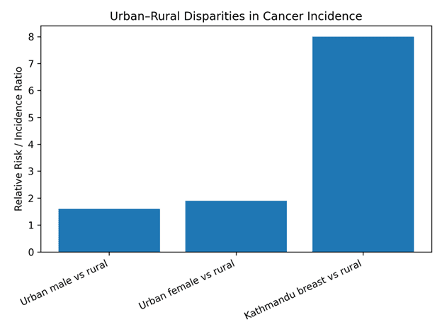 Even within the currently available data, geographic disparities are pronounced. Urban cancer incidence is estimated to be 1.6 times higher among males and 1.9 times higher among females compared with rural populations such as those in Rukum (Figure 2). Breast cancer incidence in Kathmandu is reported to be approximately eight times higher than in remote districts. These differences reflect both increased exposure to urban lifestyle risk factors and improved diagnostic capacity in urban areas, whereas many rural cancer cases remain undetected or unreported.