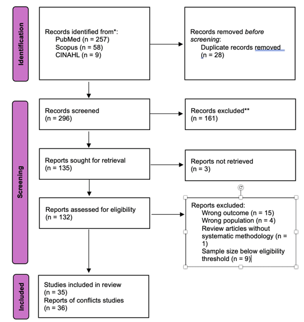 Database searches conducted in PubMed, Scopus, and CINAHL identified 224 records. After deduplication and independent title and abstract screening by four to five researchers, 135 full-text articles were assessed for eligibility. As of Binaytara's Spring Research Day 2026, 64 studies had been confirmed eligible for quality assessment, 35 had been excluded, and 36 remained under discussion pending consensus review (Figure 4).