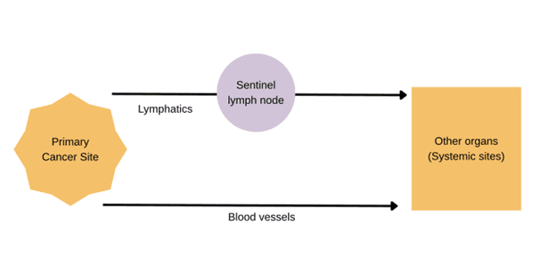 Schematic of how cancer spreads or metastasizes through blood stream and lymphatics